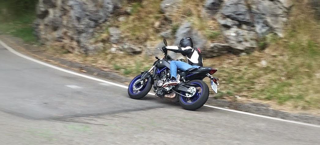 Insisto en que la moto está limitada, lo que me da otra sorpresa. Las estriberas me parece que están en muy correcta posición. Comparada con motos deportivas de menor cilindrada -véase una Ninja 300, una KTM390, etc- los casi 700cc -689cc- empujan con una fuerza mientras que, gracias a la ligereza de la MT, la permiten salir catapultada de verdad. Cuando digo de verdad quiero decir que si metes primera y, si giras el acelerador a tope, la moto se levanta. Aunque en esto habrá que entrar mejor luego, en las curvas rápidas, no en la ciudad XD.