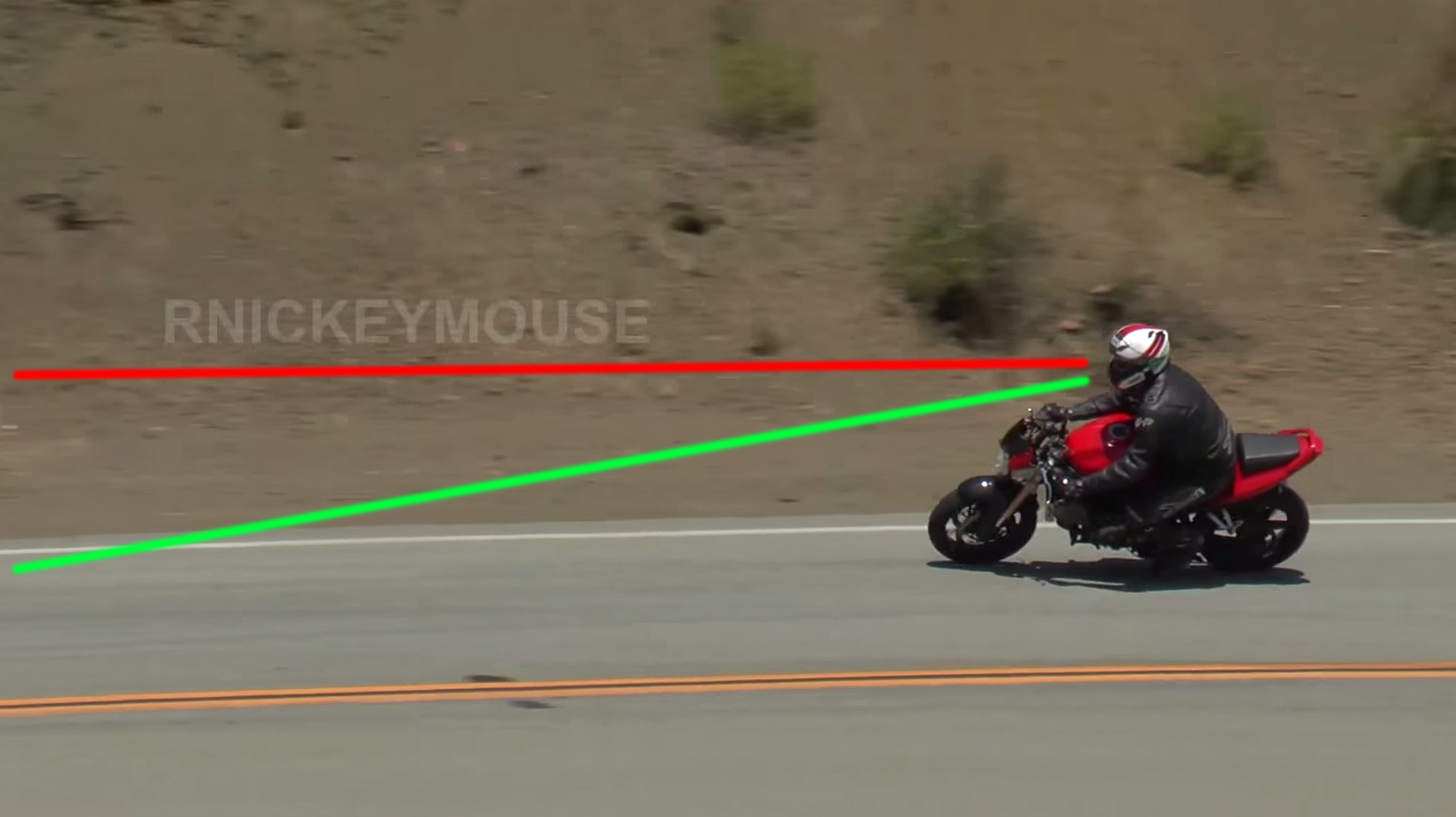 Podemos apreciar como una persona no circula muy rápido -pero su cabeza está al 90%- y no se trata de un piloto experimentado. Sino de una persona con moto-hobbie que no quiere ir por debajo del 60% y debería