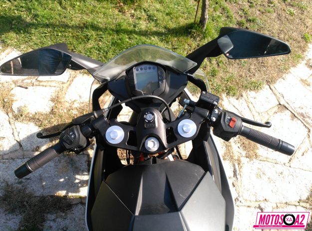 Sorprende la precisión y la falta de flaneos pese a su ligereza. Se circula muy bien y cuando la carretera tiene curvas de elevada velocidad o hay que adelantar un par de coches que van mal colocados resulta precisa e incluso divertida. Algo gracioso es que en el espejo de los generosos retrovisores se cruza por el medio nuestro brazo… En realidad para ver el lateral de la moto podemos tener de referencia la zona exterior y a modo de retrovisor la zona interior del cristal. Pero de todos modos, queda algo raro.